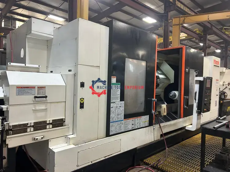 2011 MAZAK SLANT TURN NEXUS 550M CNC lathe features a 12.5" spindle bore, 80" machining length, 24" chuck, 3-axis control, and 60 hp power. Includes chip conveyor, 24" air chuck, and multitap transformer. Available mid-January 2026 approx.